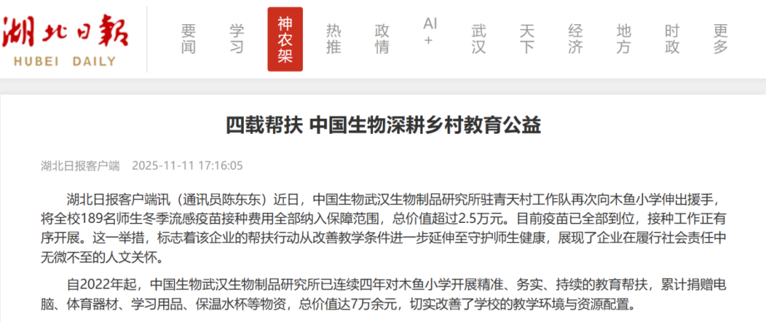 11月11日,湖北日?qǐng)?bào)客戶端聚焦報(bào)道,中國(guó)生物武漢生物制品研究所為木魚小學(xué)全體師生全額資助免費(fèi)接種流感疫苗。這不僅是從“改善教學(xué)條件”延伸至“保障師生健康”的務(wù)實(shí)之舉,更是服務(wù)國(guó)家鄉(xiāng)村振興戰(zhàn)略的生動(dòng)實(shí)踐。讓我們一起閱讀原文,共同見證四年幫扶溫暖歷程。