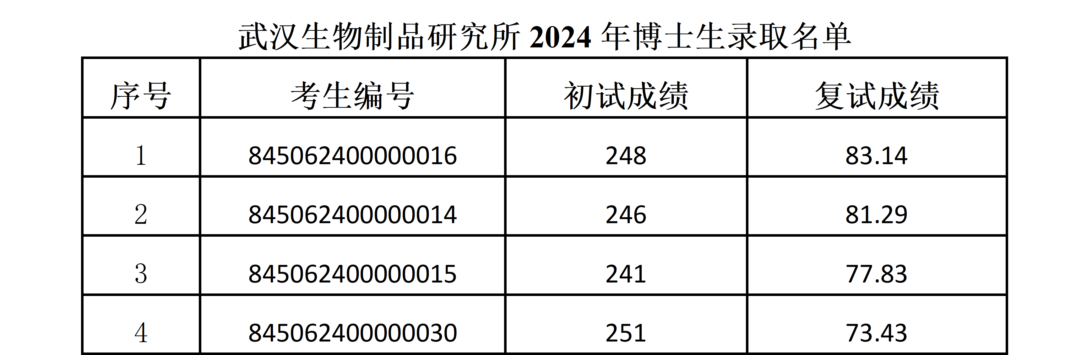 根據(jù)教育部《教育部關(guān)于做好2024年招收博士學(xué)位研究生工作的通知》文件精神,武漢所2024年博士研究生招生錄取名單在官網(wǎng)公示(為保護考生隱私使用考生號),公示時間:2024年5月06日-2024年5月19日。公示期間,考生若有疑問,可向我所有關(guān)部門反映。武漢生物制品研究所研招辦及紀委聯(lián)系方式: